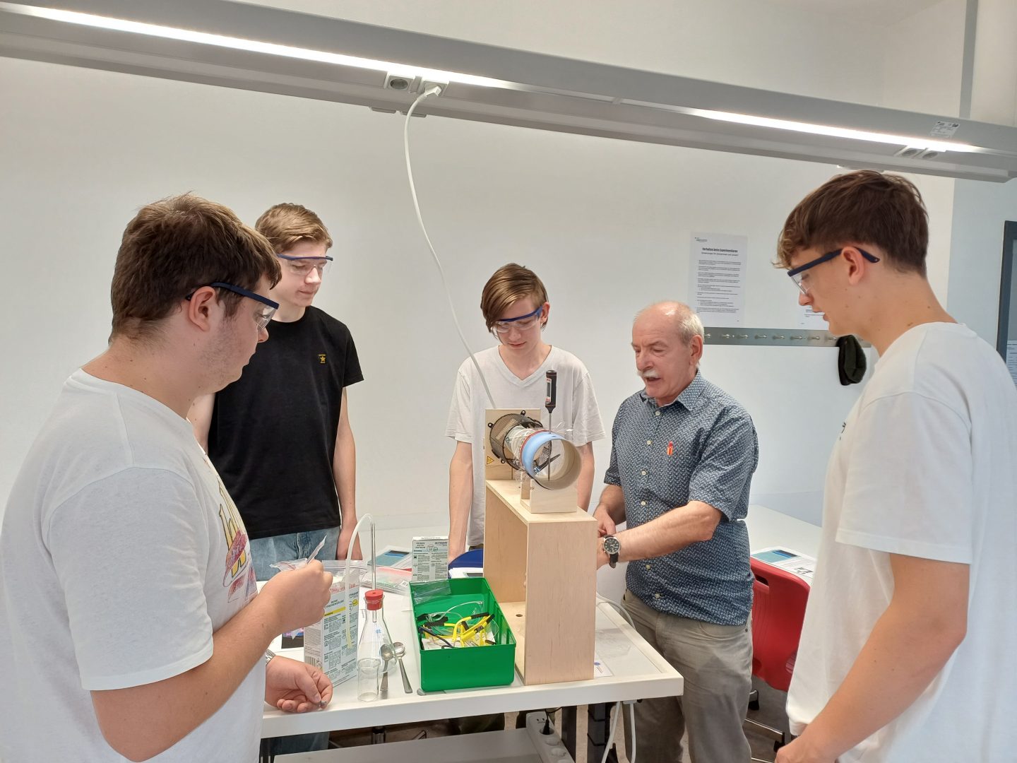Zwei Stunden Experimente rund um den Klimawandel, unterstützt von jeweils drei Physiklehrkräften, die vor Ort Fragen beantworteten und Tipps für eine sichere und sinnvolle Versuchsdurchführung sowie deren Protokollierung gaben. Die letzten zehn Minuten wurden offene Fragen geklärt und Feedback eingeholt. Die grundsätzliche Resonanz der Schüler*innen war, dass es neben dem Erkenntnisgewinn zu diesem wichtigen Thema auch Spaß gemacht hat, einmal so lange am Stück zu experimentieren.