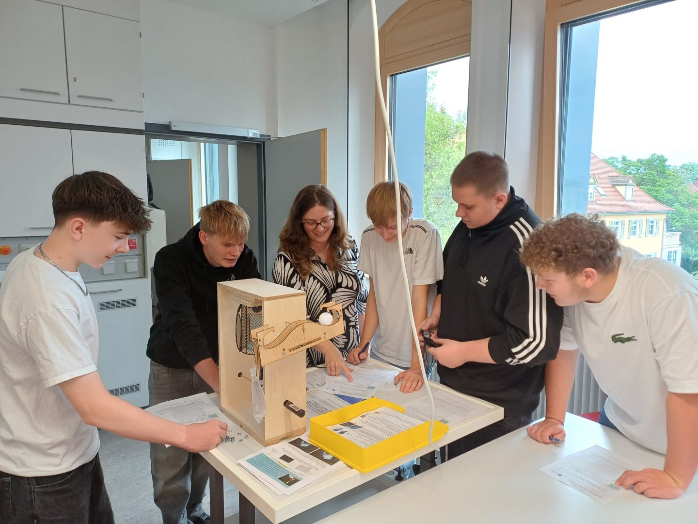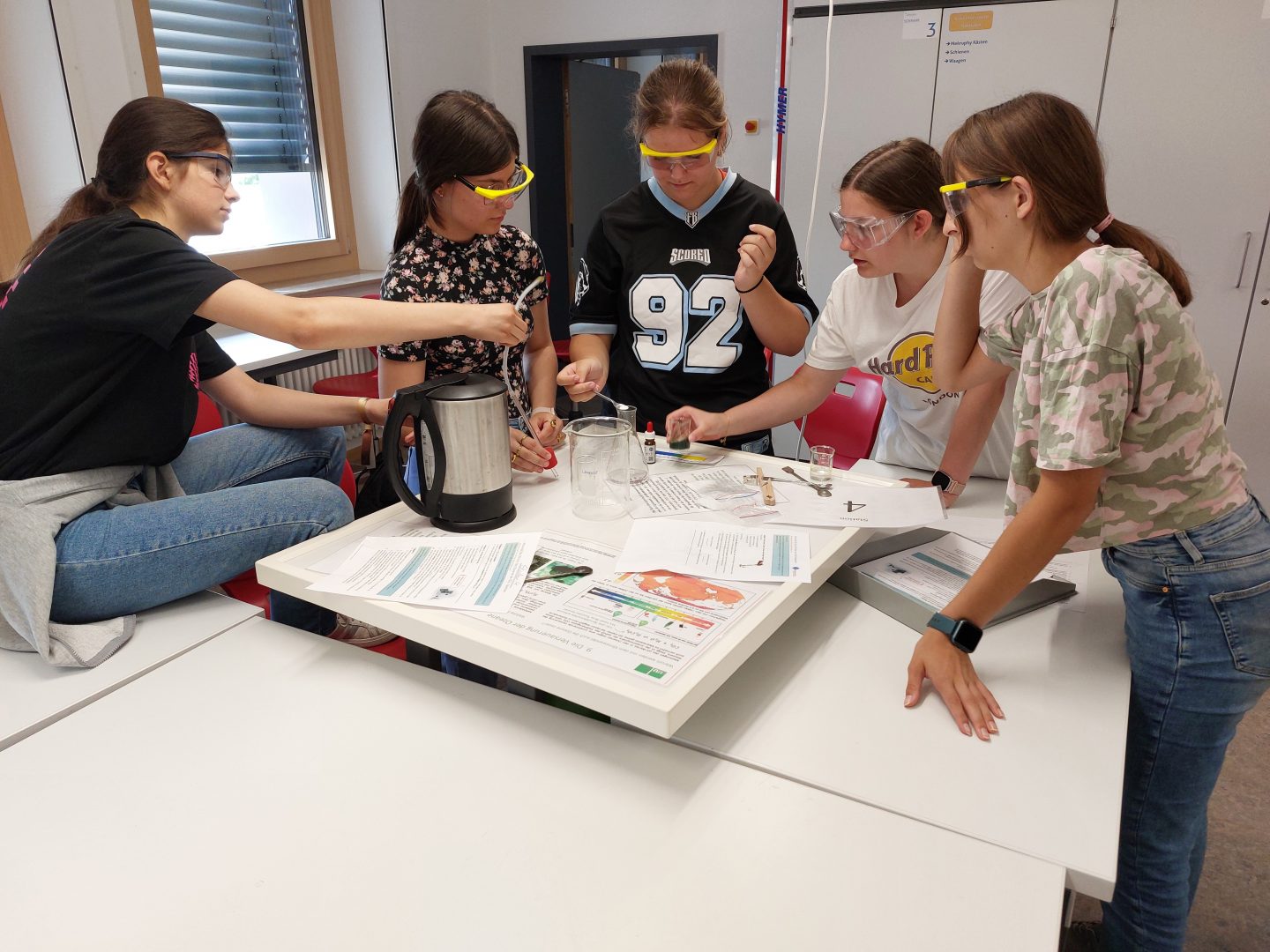 Die Fachschaft Physik hat dazu in der vorletzten Schulwoche im Juli 2025 an zwei Tagen für unsere vier neunten Klassen jeweils eine dreistündige Aktion zur Thematik durchgeführt. Nach einer Einführung, die die Entstehung und Auswirkungen der Erderwärmung in Form einer Multimedia-Präsentation zeigte, ging es an fünf Versuchsstationen für die Kleingruppen ans Werk. Jeweils 15 Minuten lang wurde an jeder Station ein Aspekt der Erderwärmung und deren Folgen experimentell beleuchtet und auf vorgefertigten Arbeitsblättern dokumentiert.