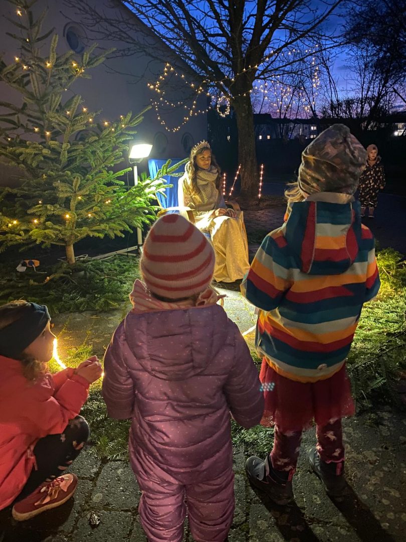Der Höhepunkt des Abends, besonders für die jüngsten Gäste, war der Besuch des Neuendettelsauer Christkinds. Für eine besonders festliche Atmosphäre sorgten die gemeinsam gesungenen Adventslieder mit Isabella von der Musikschule Rezat Mönchswald und ihrem Mann Mike.