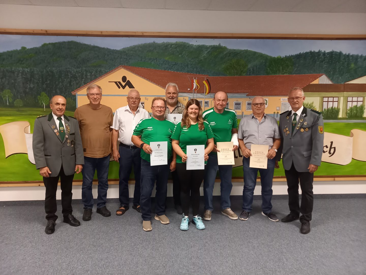 Anlässlich der Jahreshauptversammlung der Schützen galt es auch wieder einige Ehrungen vorzunehmen. Die beiden Schützenmeister Lang Hermann und Geißelmeyer Karl-Heinz konnten für 10-jährige Vereinstreue folgende Mitglieder ehren: Brandl Laura, Giese Erik, Hanke Stefan, Heumann Günther, Horrold Olesia, Vieten Sebastian und Volkert Timo. Für 20 Jahre erhielten eine Urkunde: Dauer Johannes, Ramspeck Tobias und Seitzinger Christine. Vom BSSB bekamen für 40 Jahre Mitgliedschaft eine Auszeichnung: Gracklauer Andreas, Raab Michael, Siemandel Brigitte und Wagner Klaus. Für 60 Jahre beim BSSB konnten Beyerlein Josef, Fleischmann Walter, Raab Georg und Ramspeck Johann geehrt werden. Eine seltene Ehrung wurde dem ältesten Vereinsmitglied Zabold Josef zuteil, er ist seit 70 Jahren treues Vereinsmitglied und erhielt dafür vom BSSB ebenfalls eine Ehrung, die ihm die beiden Schützenmeister persönlich zuhause vorbeibrachten. Freudig überrascht wurden dann noch die langjährigen Mitglieder Arnold Robert, Lechner Helmut und Leng Hans, die zu neuen Ehrenmitgliedern ernannt wurden.