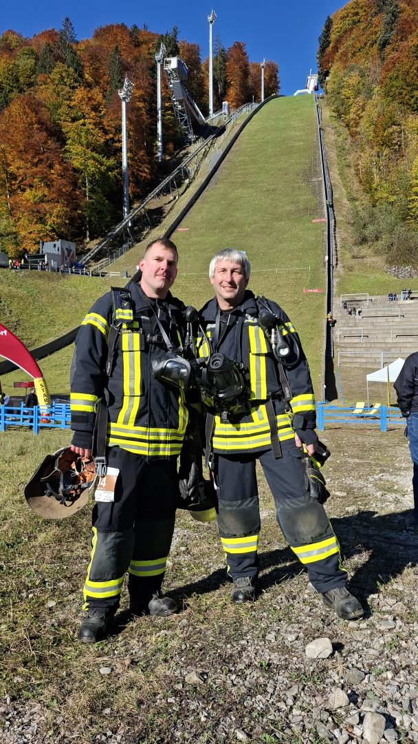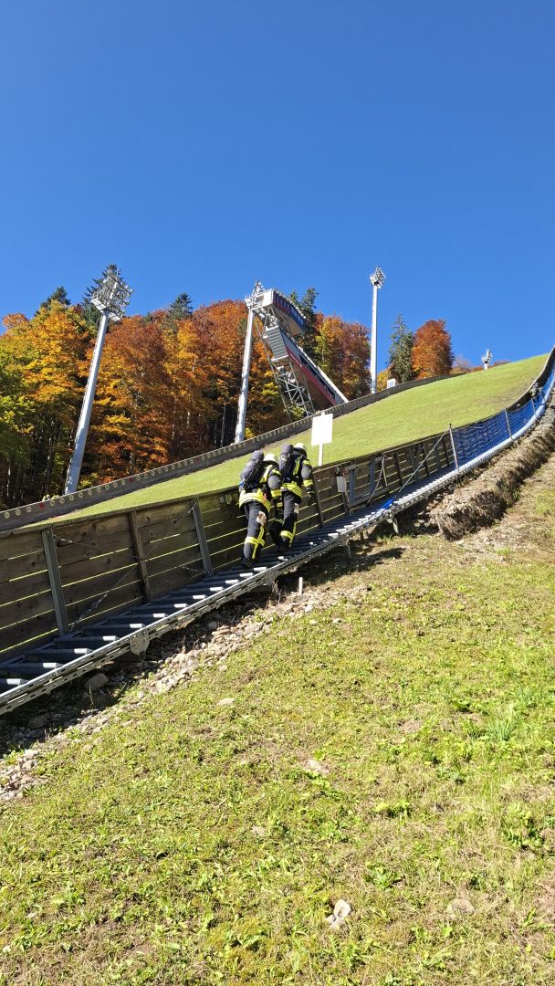 Nach einer spannenden Anmelderunde im Frühjahr 2025 konnten wir eins von drei geplanten Teams für den Schanzenlauf in Oberstdorf anmelden, bis das Anmeldefenster nach wenigen Minuten „wegen Überfüllung“ geschlossen war. Unser Kommandant und sein Stellvertreter würden also die Herausforderung wagen. Es ist schon erstaunlich, wie viele Kameraden deutschlandweit wild darauf waren, mehr als 1.000 Stufen über eine Länge von 412 Metern und 162 Höhenmetern in voller Montur – unter Atemschutz – hinauf auf die Skiflugschanze zu bewältigen…