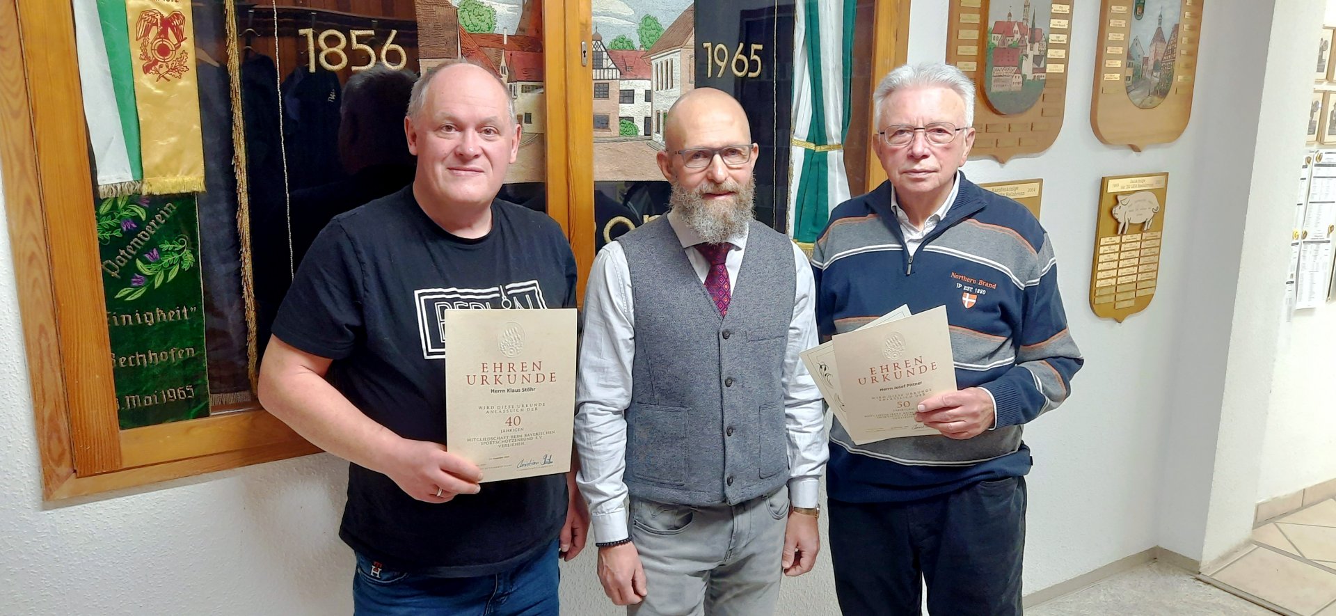 Für 50 Jahre Mitgliedschaft konnte Josef Pittner geehrt werden. (Auf dem Bild von links: Klaus Stöhr, 2. Schützenmeister Frank Loh, Josef Pittner).