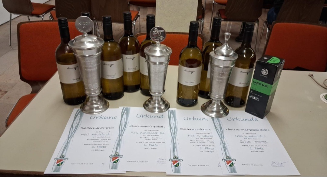 Die HSG Windsbach kehrte vom Kloster-Wanderpokal in Petersaurach mit drei Pokalen zurück. Gruppe A: 1. Platz (1.144 Ringe), Gruppe C: 2. Platz (1.068 Ringe). Damenklasse: 1. Platz (871 Ringe). Jugendklasse: 1. Platz (850 Ringe).