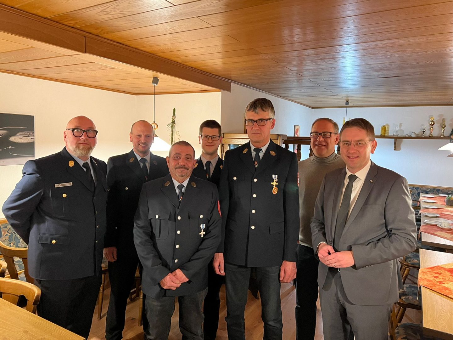 Landrat Dr. Jürgen Ludwig würdigte die langjährige Treue verdienter Kameraden: Abdullah „Abo“ Oguzcan wurde für 25 Jahre aktiven Dienst geehrt. Seit dem Jahr 2000 ist er eine unverzichtbare Stütze bei Einsätzen und Festen. Stefan Seitz erhielt das staatliche Ehrenzeichen für 40 Jahre aktiven Dienst. In seiner beeindruckenden Laufbahn war er unter anderem 1. Kommandant sowie insgesamt 24 Jahre lang stellvertretender Kommandant. Mit allen sechs Stufen der Leistungsprüfung ist er ein fachliches Vorbild.