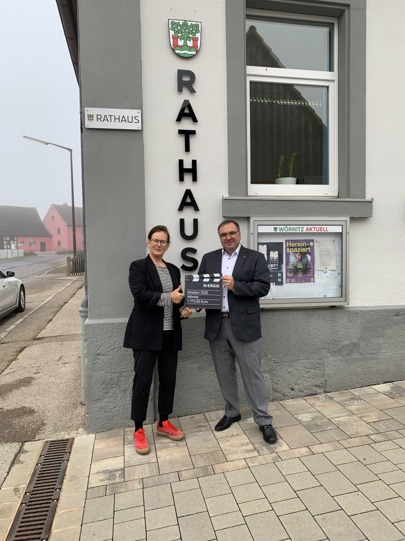 Am Dienstag, 2. September 2025, hat die N-ERGIE Kinotour über 270 Zuschauer*innen zum Open-Air-Filmabend mit der Komödie „Voilà Papa“ nach Wörnitz gelockt. Der gesamte Eintrittserlös in Höhe von rund 1.770 Euro kommt dem Spielplatz am Feuerwehrhaus in Wörnitz zugute. Markus Prokopczuk, Betreuer für kommunale Kunden der N-ERGIE, übergab die Spende jetzt an Bürgermeisterin Friederike Sonnemann.