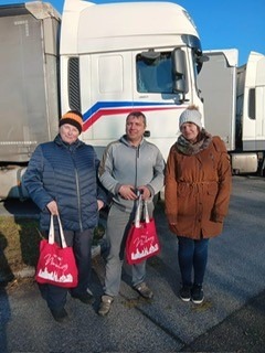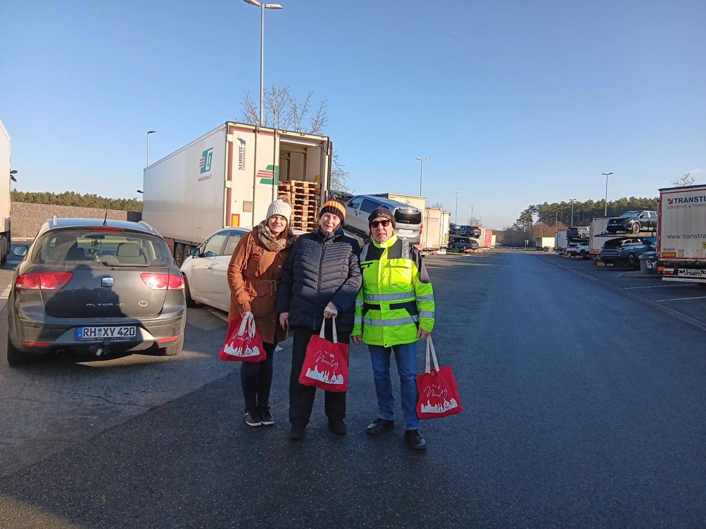 Auch in diesem Jahr fuhr ein Team der Lebensmittelretter Klaus Elmer, Anita Schubert und Lisa Bär aus Kammerstein wieder Parkplätze auf der A6 und der Rastanlage Nürnberg / Feucht West an. Hier wurden 100 LKW-Fahrer mit einem kleinen Päckchen beschenkt, die die Feiertage nicht daheim bei ihren Familien verbringen können, sondern diese besonderen Tage auf einem Rastplatz verbringen müssen. Die Überraschung gelang uns wieder und die Freude der Fahrer war groß, dass jemand an sie denkt, ihre Arbeit schätzt und auch ein nettes Wort übrig hat.