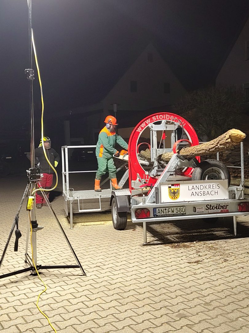 Hierfür stellte der Landkreis Ansbach der FFW Vestenberg den sogenannten Spannungssimulator zur Verfügung, mit dem das Verhalten von verspannten Baumstämmen realitätsnah und zugleich kontrolliert nachgebildet werden kann. Unter Flutlicht wurden verschiedene Lagen gezeigt und Schritt für Schritt abgearbeitet. Die Teilnehmer konnten dabei unterschiedliche Schnitttechniken kennenlernen und die Auswirkungen auf das unter Spannung stehende Holz direkt verfolgen.