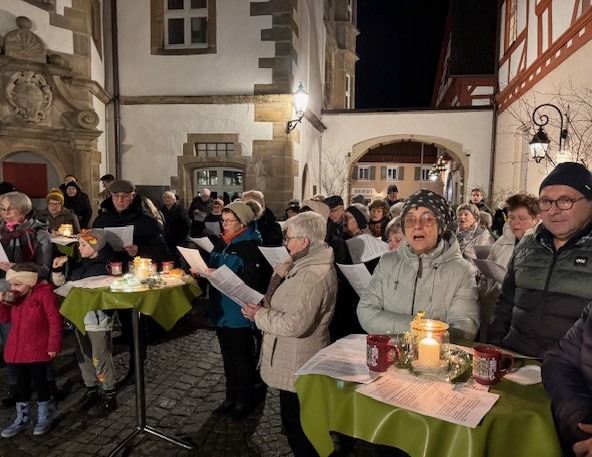 Zahlreiche Besucher versammelten sich im festlich geschmückten Schlosshof, um gemeinsam Weihnachtslieder zu singen. Die bekannten Melodien von „Alle Jahre wieder“ über „Jingle Bells“ bis zum Schlusslied „O du fröhliche“ sorgten für eine besinnliche Stimmung und luden zum Mitsingen ein. Die Liedertexte waren ausgelegt und die Besucher stimmten freudig in die Weihnachtsweisen mit ein.
